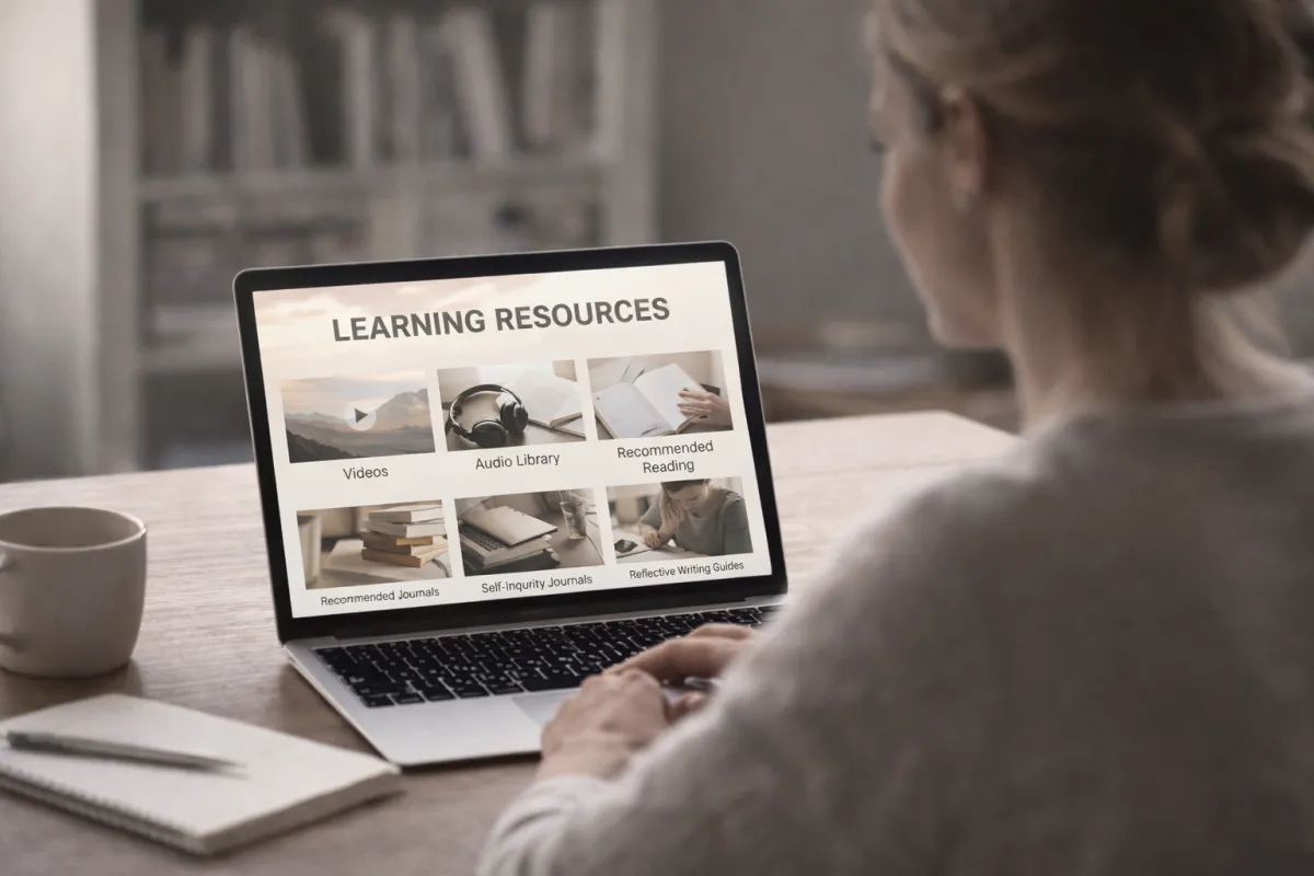 Digital tools for self-assessment, journaling, and guided contemplation, designed to support clarity and integration within an educational context.